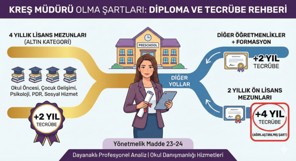 Müdürlük için en avantajlı grup, doğrudan çocuk gelişimi, eğitim ve insan davranışı eksenine yakın lisans mezunlarıdır.